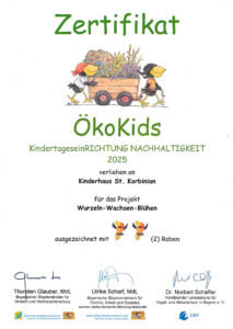 Rechtmehringer Kinderhaus St. Korbinian erhält ÖkoKids-Auszeichnung: Das Projekt „Wurzeln – Wachsen – Blühen“ überzeugt die Jury mit gelebter Nachhaltigkeit – die Auszeichnung wurde vom Bayerischen Landesbund für Vogel- und Naturschutz (LBV) und dem Bayerischen Staatsministerium für Umwelt und Verbraucherschutz vergeben
